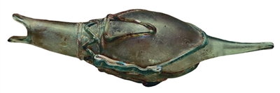此件鸭形玻璃注,长20.5厘米、腹径5.2厘米,重70克,呈淡绿色,半透明,质地光亮。整体为鸭形,口如鸭嘴状,长颈鼓腹,拖着一个细长的尾巴,尾尖部分略有残缺。背上还用玻璃条粘出了一对雏鸭式的三角形翅膀,腹下两侧则粘着一段波状的折线纹,用来模仿鸭子的两只脚。